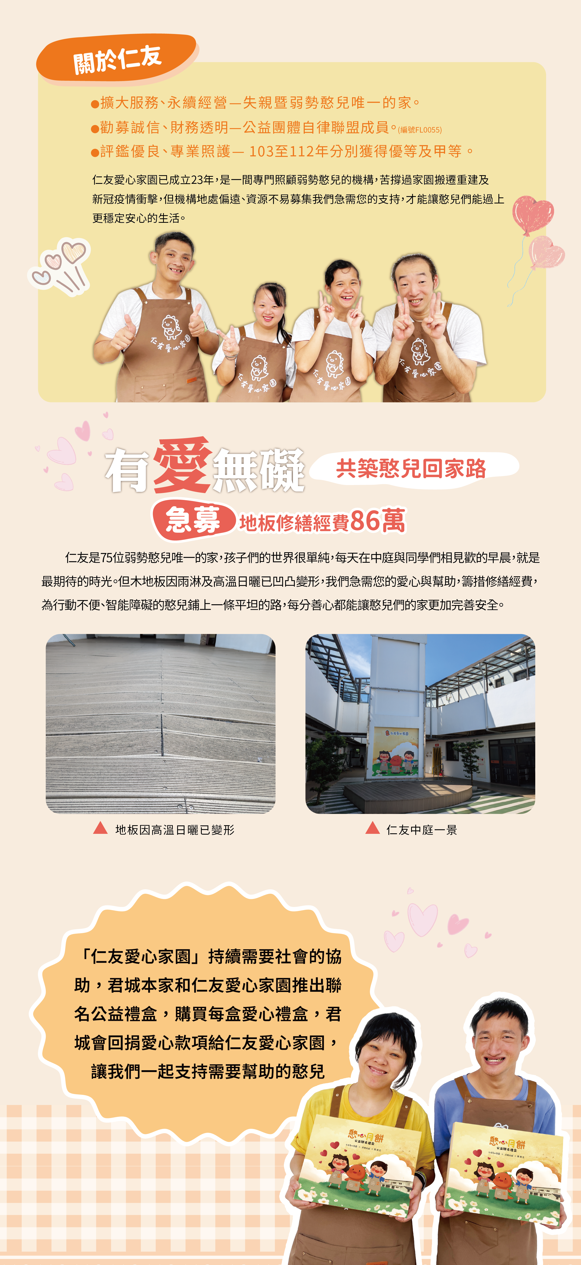 買禮盒,做公益於君城公益賣場購買每盒捐出愛心款項,支持[仁友愛心家園]幫助失親憨兒安心成長■ 金獎鳳梨酥x4 ■ 翠玉檸茶酥x4 ■ 烏豆蛋黃酥x3 ■ 烏龍茶小廣x3 ■ 奶油夏威夷餅乾x4 ■巧克力杏仁餅乾x4
