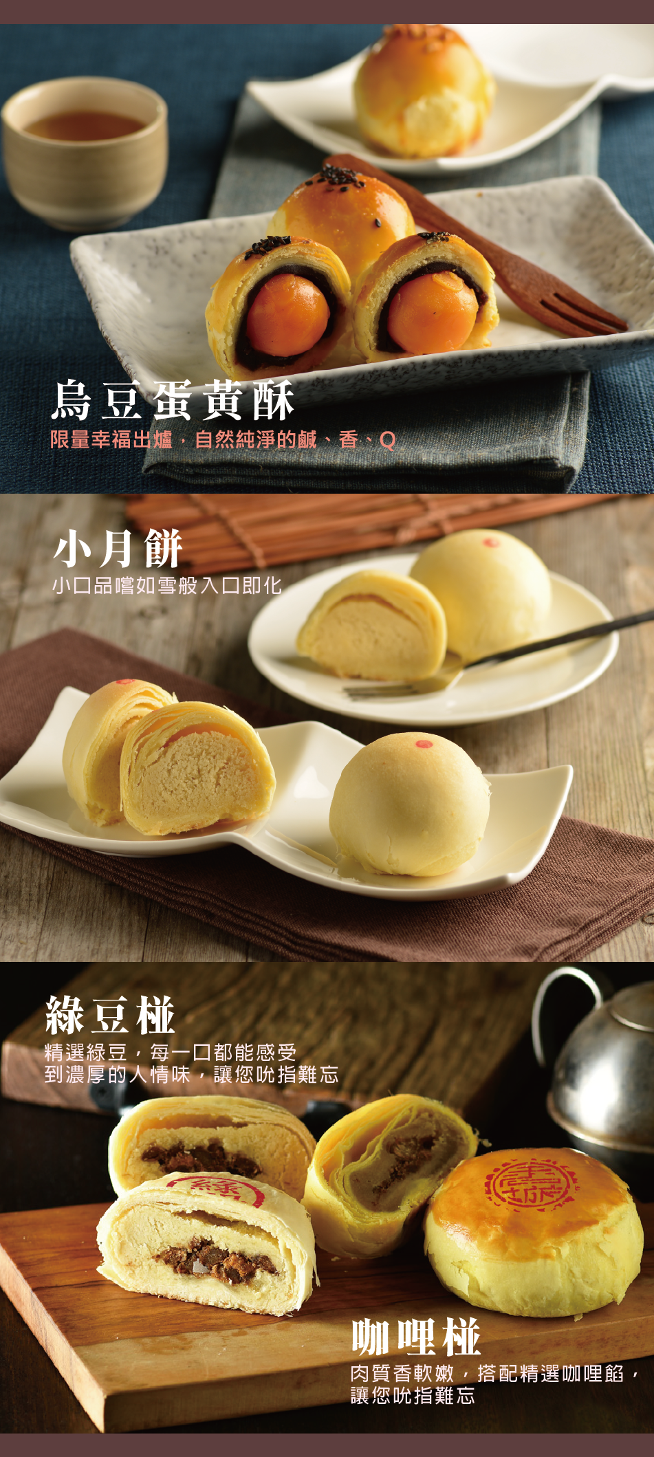 ■ 綠豆椪x2(葷) ■ 咖哩椪x2(葷) ■ 烏豆沙蛋黃酥x3 ■ 小月餅x3